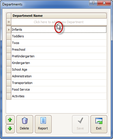 Create Departments (like Infants, Toddlers, PreK, Kindergarten, Administration, Transportation, Food Service, etc.). Departments are then connected to Work Areas and Classrooms.