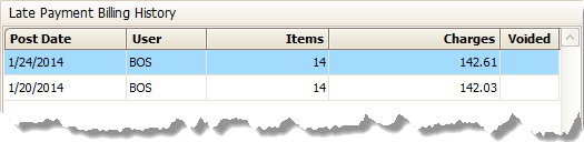 At the Late Payment Calculator screen a list of recent billing batches will be displayed under the heading Late Payment Billing History. Dbl-click the line you wish to view or void.