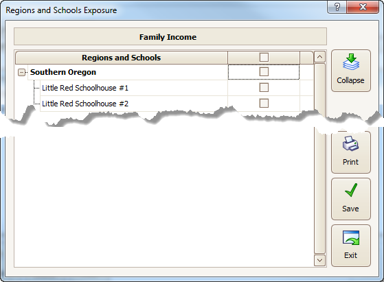 - You will now be on be on the Regions and Schools Exposure screen. Check all locations that need access to this group. You will not be able to assign any items in this group (to an account, child, etc.) until you Expose it. See: Exposure Settings. Select Save, Exit.