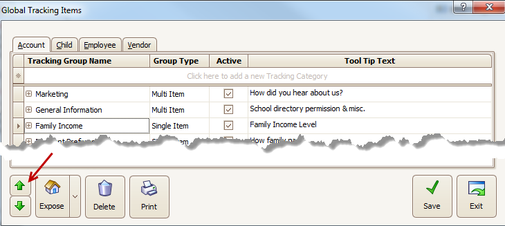 - Click a tab at the top depending on whether these tracking items will apply to the Account (family as a whole), Child, Employee or Vendor.