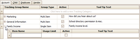 Tracking Items are categories you create that may apply to many families, children, employees or vendors. Possible uses of Tracking Items include : marketing (how someone heard about you), marital status, parent volunteers, bus runs, programs, activities, field trips, allergies, developmental milestones and whether certain forms or permission slips have been received. Most anything you’d want to track would work.