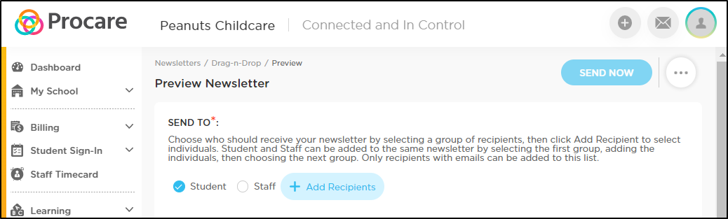 Create and send newsletters to parents and staff. Save newsletters as drafts or create templates for later.