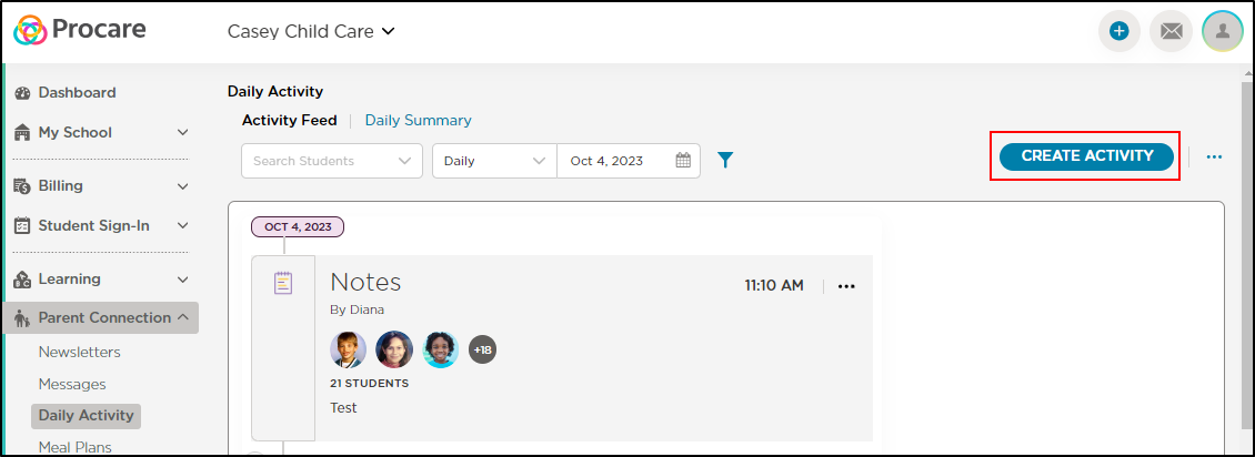 - Vaya a la pantalla Conexión para padres > Actividades diarias . A continuación, haga clic en Crear actividad.