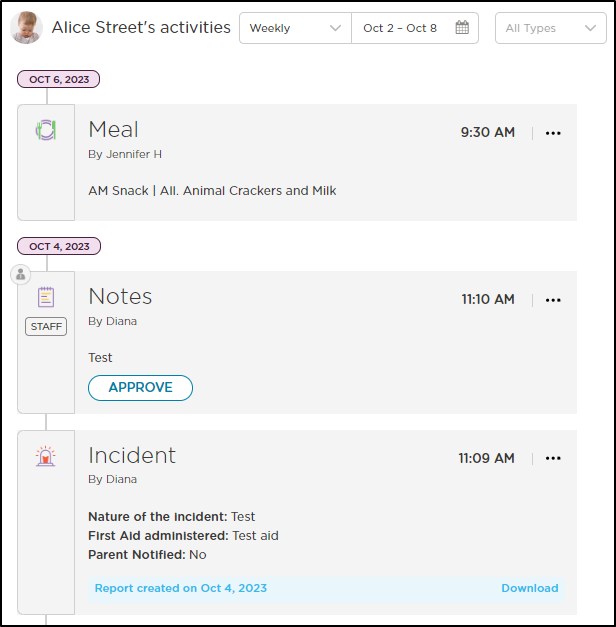 Importante: Cuando se selecciona "Solo personal: requiere la aprobación del administrador para los padres", se requiere que un administrador revise y apruebe la actividad antes de enviarla a los padres. Antes de la aprobación, la actividad solo aparecerá para los administradores en la pantalla Conexión principal > actividad diaria.