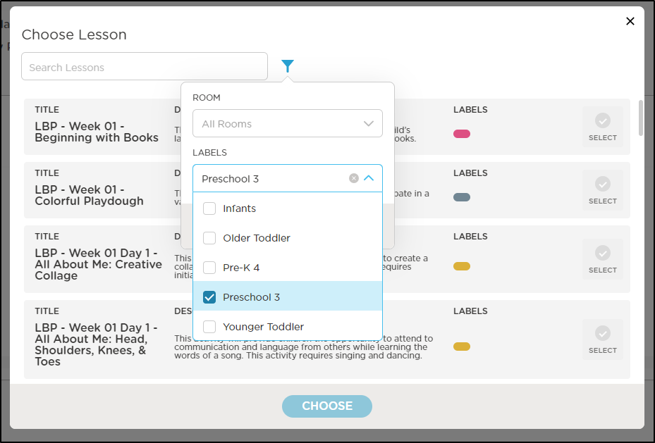 On the Choose Lesson modal, click the filter icon, then select the Labels drop-down and check the age-group that best corresponds to the age of children in your room. Click ’Apply’ to return lessons that are most age-appropriate for your students.